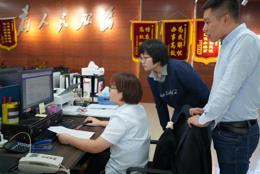 ▲閑林街道紀(jì)工委工作人員正在查閱聯(lián)榮村所有“靈活就業(yè)補助”人員的申報信息