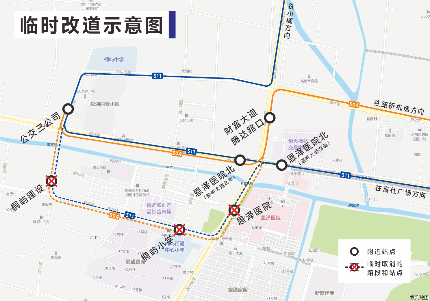 受桐東線(路橋大道--文化路段)道路綜合改造提升工程封閉施工影響。即日起,途經(jīng)該路段的304路、311路等兩條公交線路將臨時改道,雙向由桐東線、桐楊路調(diào)整至路橋大道運(yùn)行。改道后臨時取消??客Z建設(shè)、桐嶼小學(xué)、恩澤醫(yī)院共3對站點,臨時增加??慷鳚舍t(yī)院北站點。