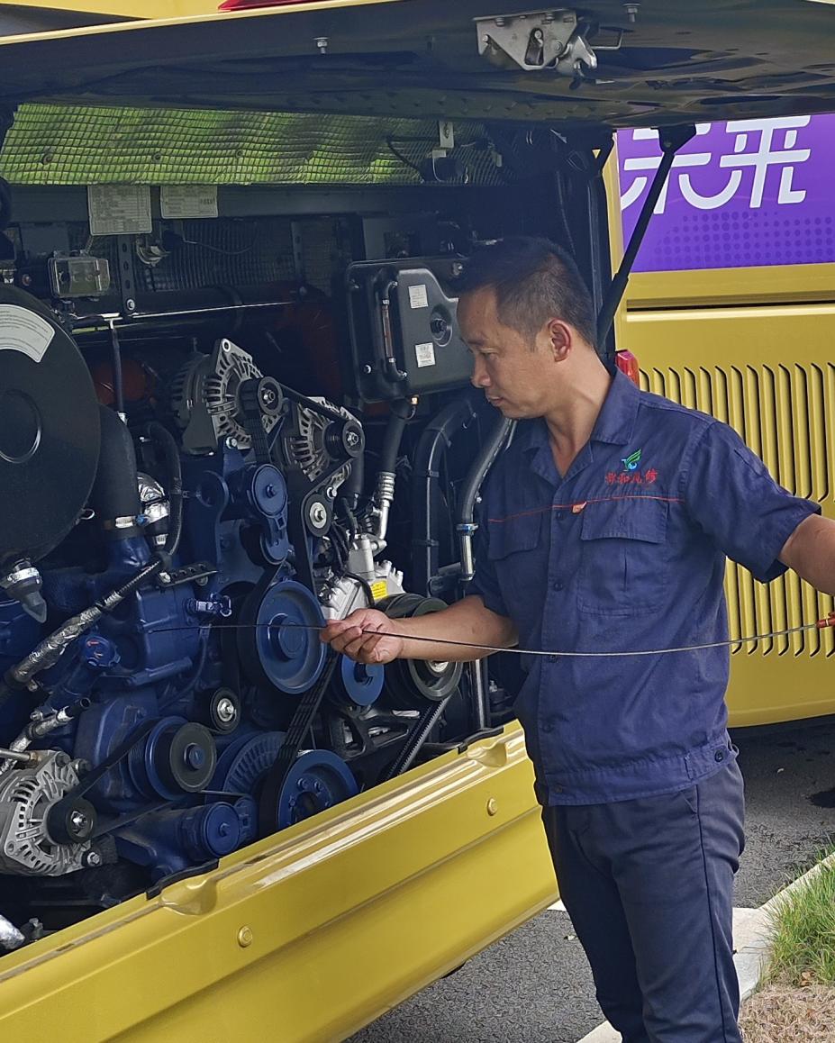 三、“補(bǔ)氣血”,做好車輛檢查。修理公司修理人員攜手宇通服務(wù)有限公司售后技術(shù)人員,堅(jiān)持“安全隱患零容忍”原則,嚴(yán)格按照相關(guān)技術(shù)要求標(biāo)準(zhǔn)檢查宇通亞運(yùn)賽事官方車輛,全面檢查車輛的發(fā)動(dòng)機(jī)系統(tǒng)、底盤、電器、空調(diào)等部位,重點(diǎn)檢查油路、電路、剎車、轉(zhuǎn)向等系統(tǒng)性能。檢查車輛共計(jì)30輛,發(fā)現(xiàn)問題4項(xiàng),現(xiàn)場(chǎng)及時(shí)將問題車輛進(jìn)行維修維護(hù),從根源上杜絕和防范安全隱患。