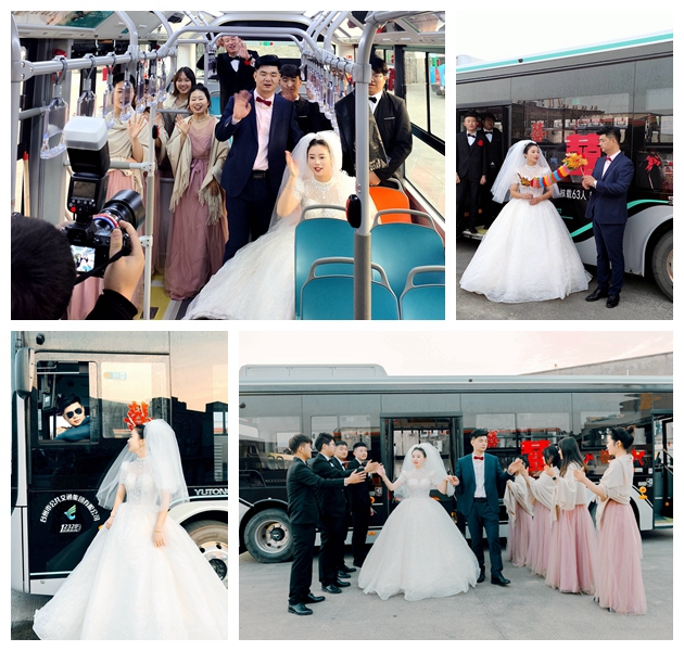 大紅“囍”字和緞帶,貼在363路公交車上,這對(duì)新人身著禮服,在眾人的祝福聲中喜結(jié)連理。對(duì)他們而言,是臺(tái)州公交這個(gè)“紅娘”,牽起了彼此的緣分,在這里,他們從相識(shí)到相知,從相知到相戀,終于共同走進(jìn)了婚姻的殿堂。這個(gè)特殊的日子里,他們以公交車為背景,拍攝了婚禮MV和婚紗照,用來紀(jì)念這段因公交而走到一起的情緣。