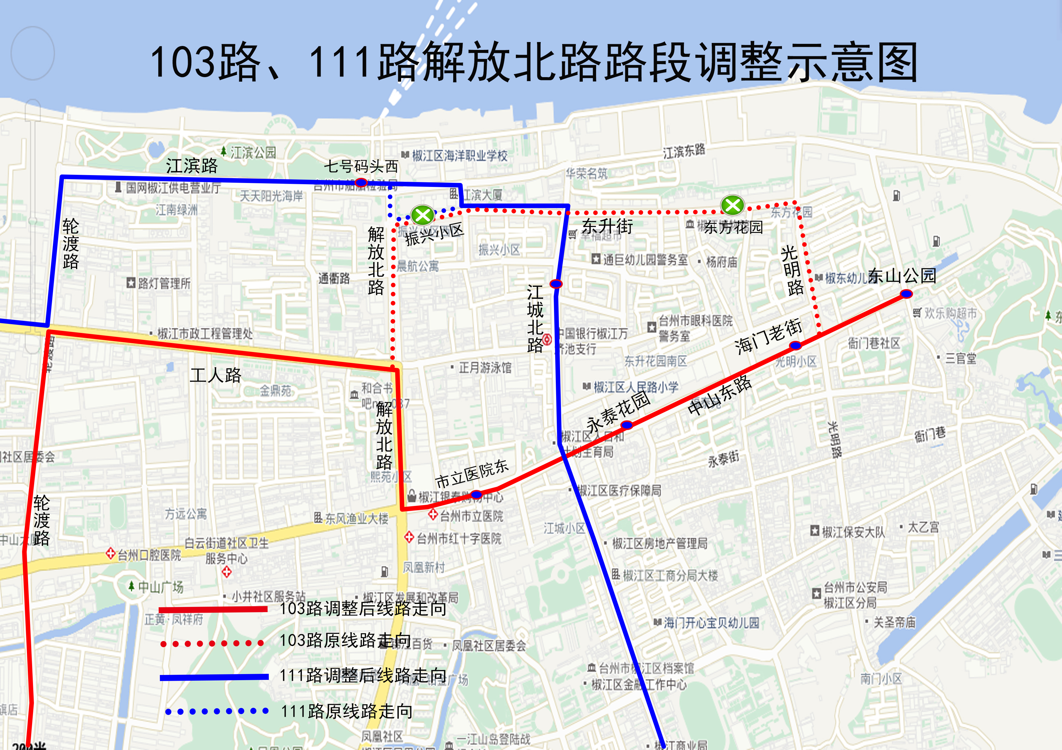 其他公交線路:103路調(diào)整為由工人東路經(jīng)解放北路、中山東路至原線路,取消振興小區(qū)、東方花園站點,啟用市立醫(yī)院東、永泰花園、海門老街站點。111路調(diào)整為雙向經(jīng)章安路至原線路,取消振興小區(qū)站點。