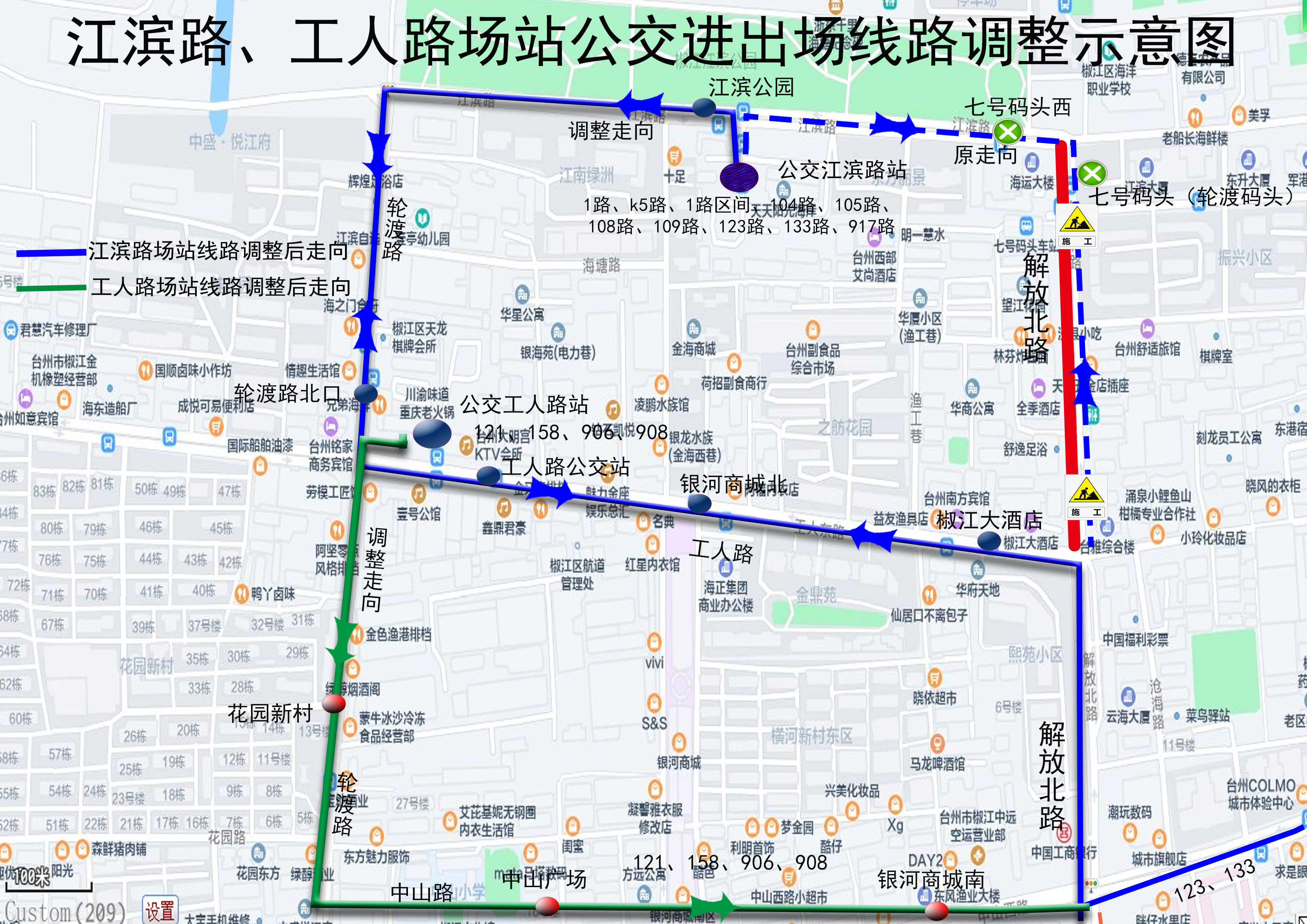 江濱路公交站始發(fā)線路:1路、1路區(qū)間、104路、105路、108路(外環(huán))、109路、123路、133路、917路、K5路共10條公交線路調(diào)整為輪渡路、工人路至解放北路。臨時取消七號碼頭站,啟用輪渡路北口、工人路公交站、銀河商城北、椒江大酒店等站點。
