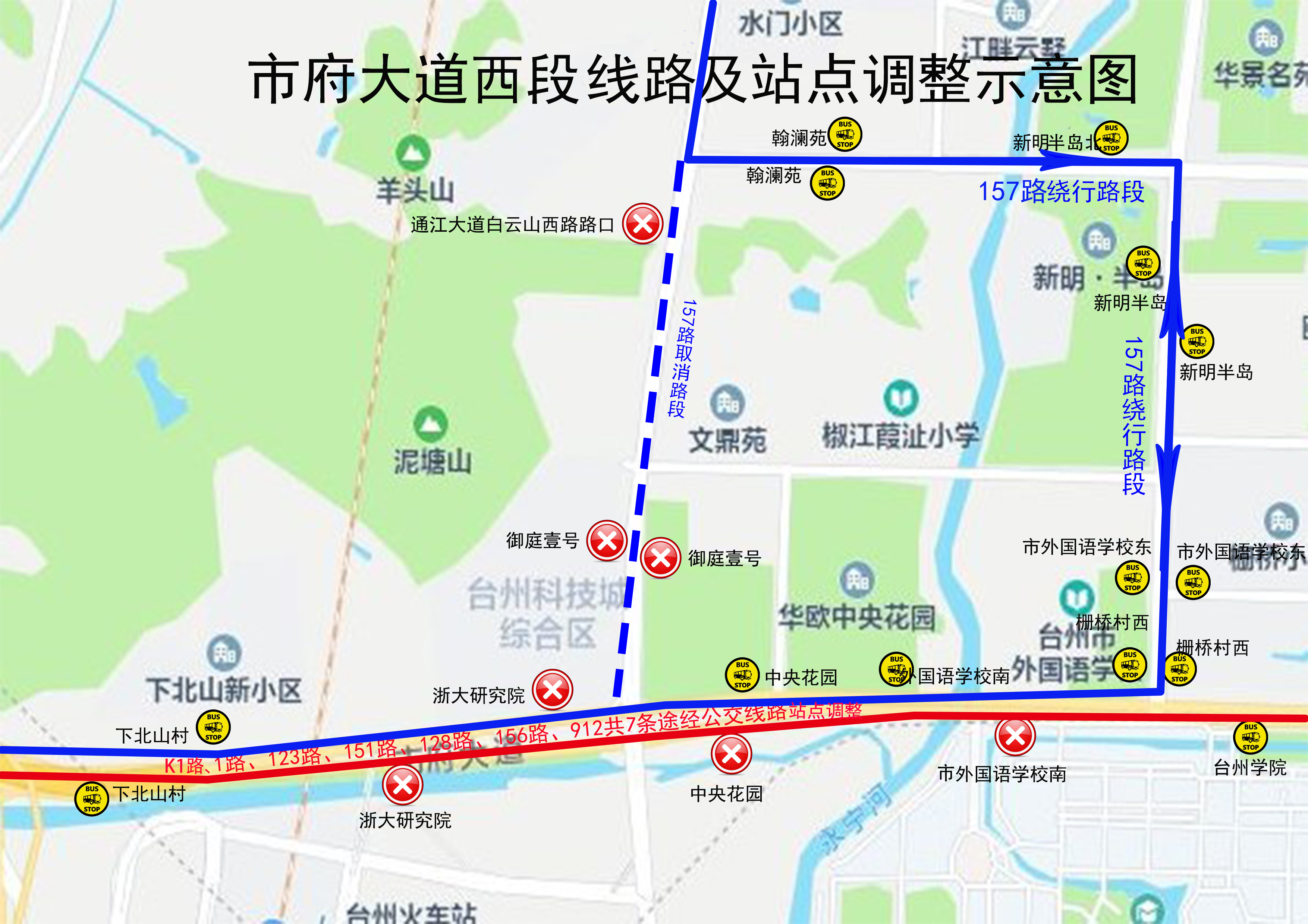 一、1路、123路、151路、128路、156路、912路、K1路共7條線路施工路段局部站點調(diào)整。西往東(內(nèi)環(huán)往臺州學(xué)院方向):線路調(diào)整經(jīng)快速路主干道運行,取消路南的浙大研究院、中央花園、市外國語學(xué)校南站點。東往西(臺州學(xué)院往內(nèi)環(huán)方向):線路調(diào)整經(jīng)輔道至市府大道快速路,沿用外國語學(xué)校南、中央花園單向??空?。