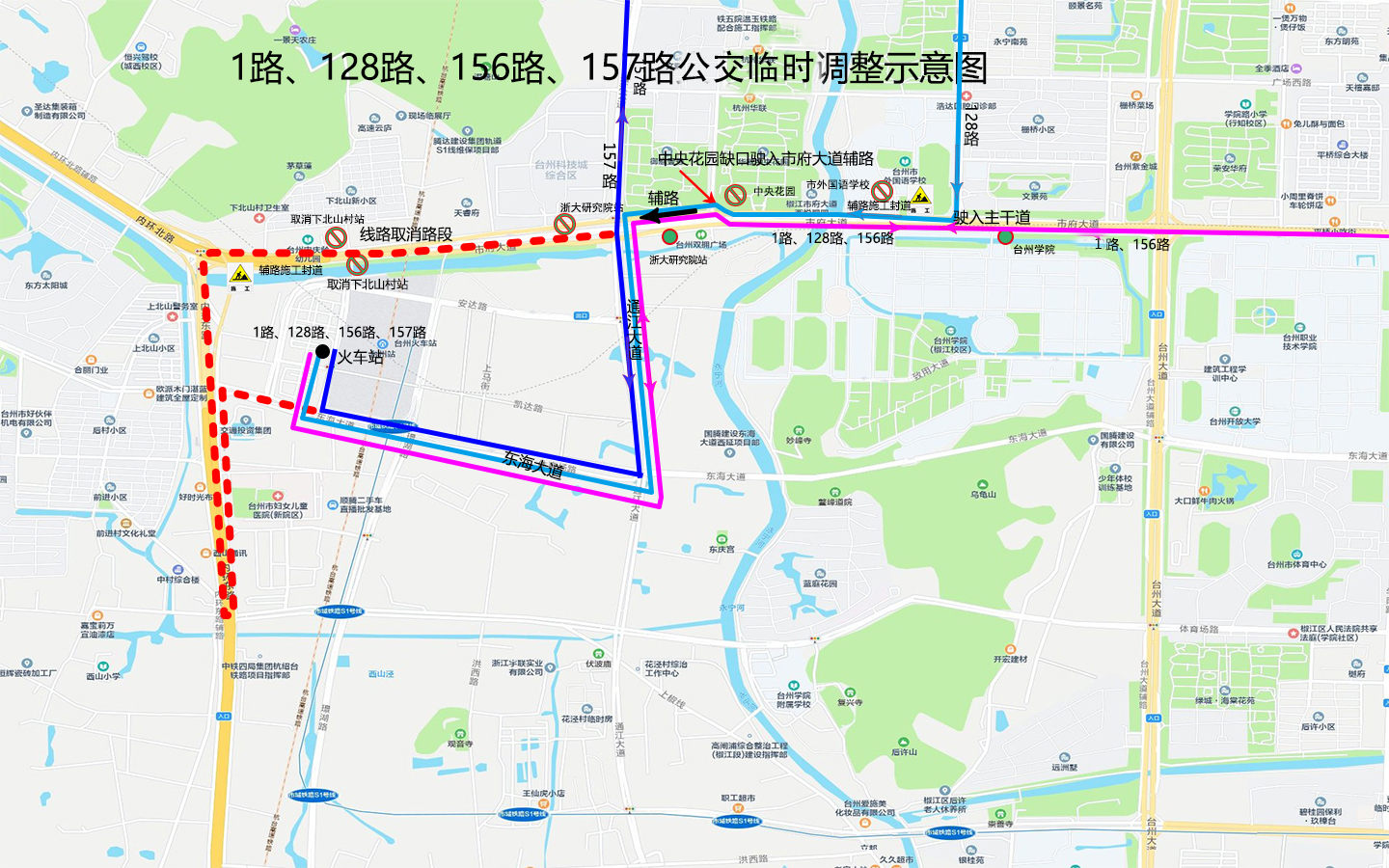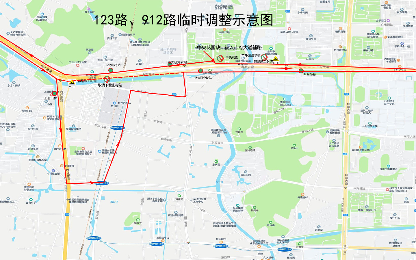 三、123路、912路西往東(黃巖往椒江方向):調(diào)整繞行內(nèi)環(huán)東路輔路、體育場路、璟湖路、安達路、通江大道接原線路。東往西(椒江往黃巖方向):調(diào)整由中央花園附近道口駛?cè)胼o路接原線路。