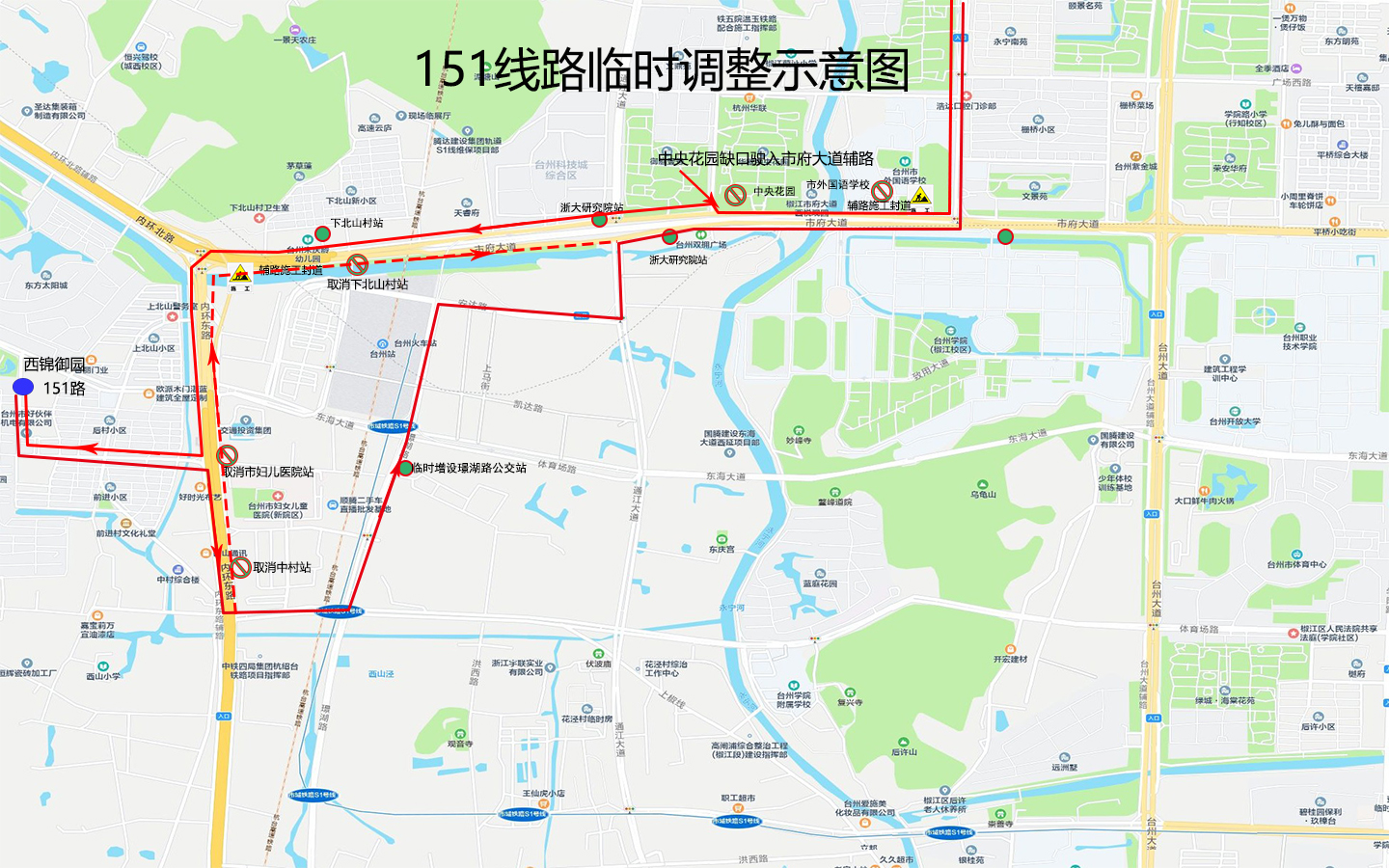 二、151路西往東(西錦御園往東山公園方向):調(diào)整繞行內(nèi)環(huán)東路輔路、體育場路、璟湖路、安達路、通江大道接原線路。東往西(東山公園往西錦御園方向):調(diào)整由中央花園附近道口駛?cè)胼o路接原線路。