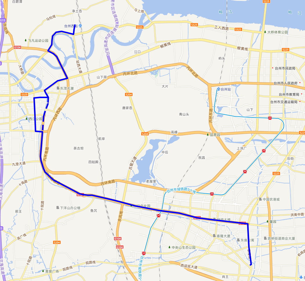 路橋短途南站、泰隆街、路橋大道、G104國(guó)道、二環(huán)南路、勞動(dòng)南路、勞動(dòng)北路、縣前街、環(huán)城東路、東浦路、二環(huán)北路、站前大道、站西大道。