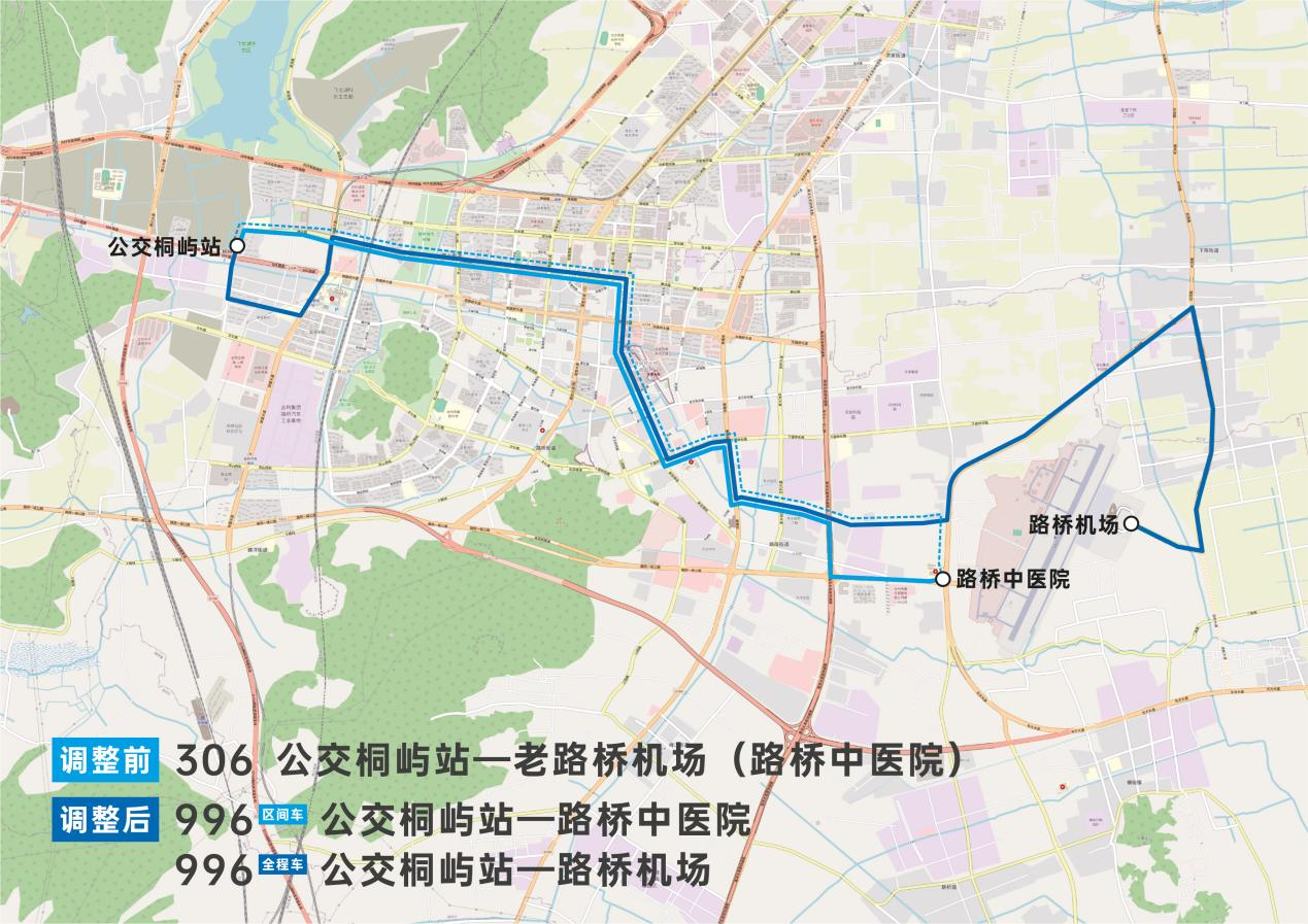 由“公交桐嶼站—老機(jī)場(chǎng)”變更為996路“公交桐嶼站—路橋機(jī)場(chǎng)”和996區(qū)間“公交桐嶼站—路橋中醫(yī)院”。
