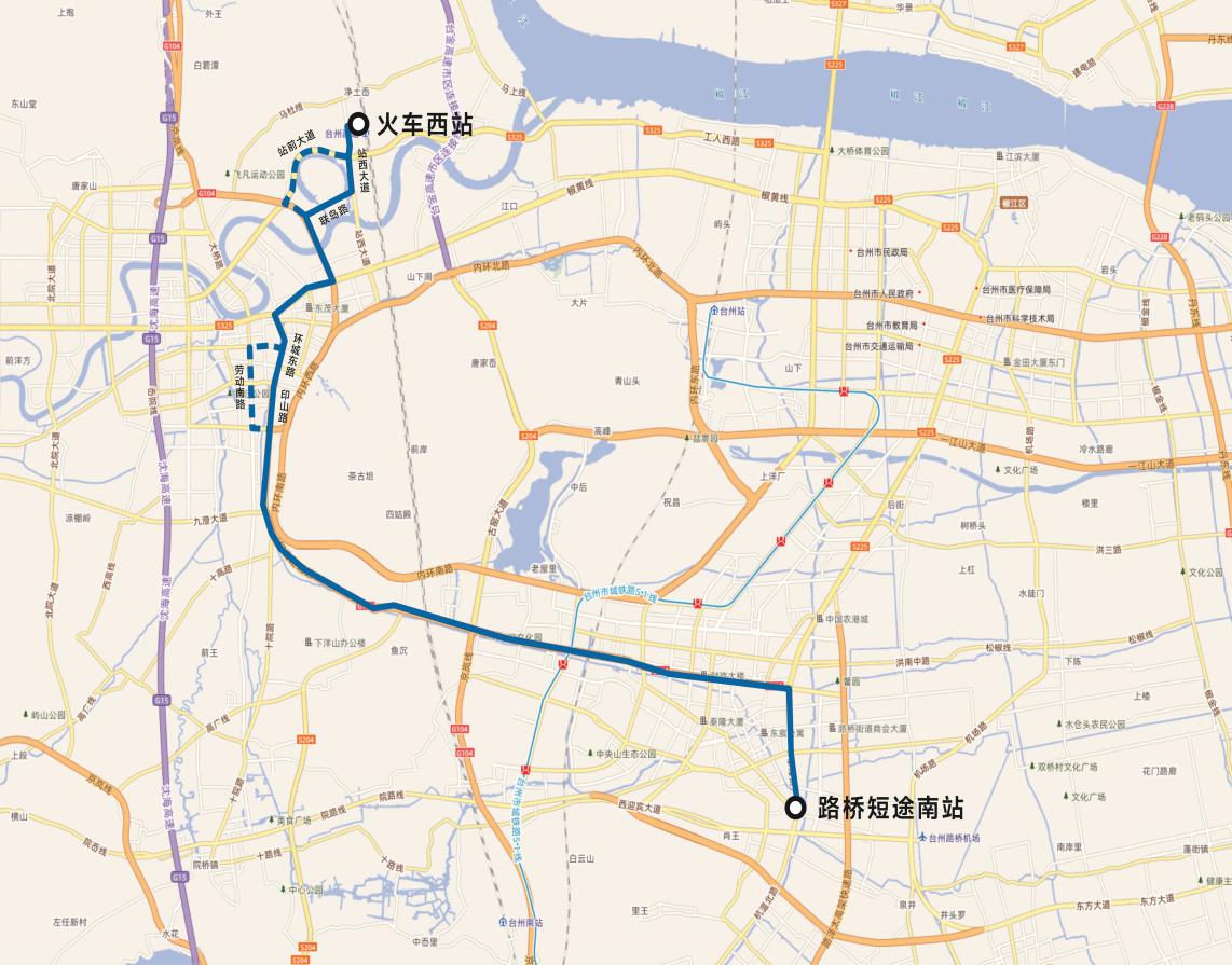 路橋短途南站-泰隆街-路橋大道(東)-路橋大道(西)-大環(huán)線-印山路-環(huán)城東路-東浦路-黃椒路-二環(huán)東路-聯(lián)島路-站西大道-火車西站。(不再經(jīng)過勞動南路、站前大道)