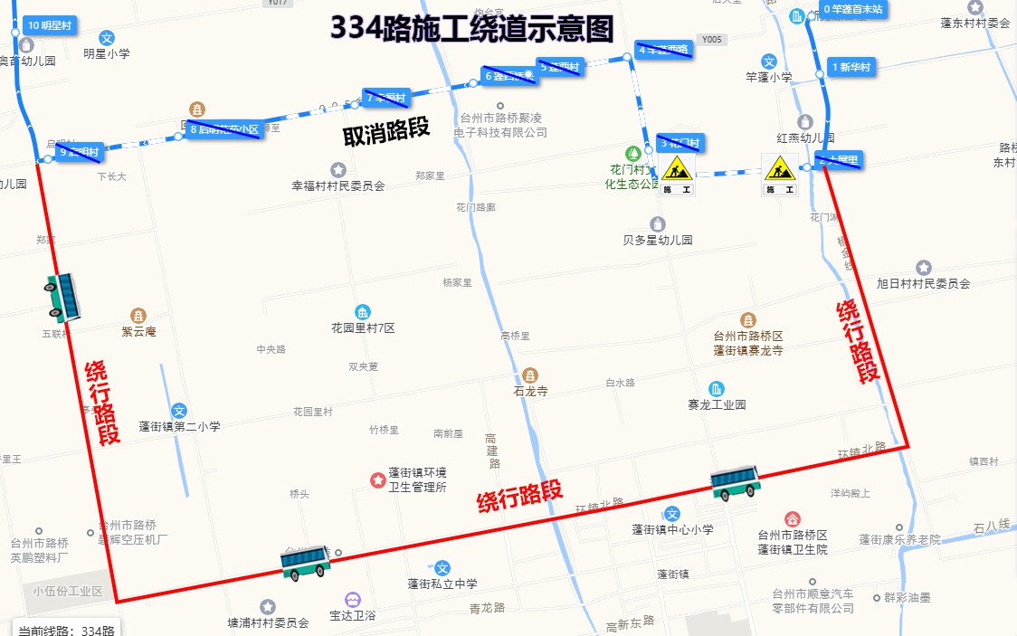 為配合花門村至大屋里道路封閉施工需要,即日起334路由中心街臨時繞道環(huán)鎮(zhèn)北路至椒金線(竿蓬首末站),不再途經(jīng)005鄉(xiāng)道。