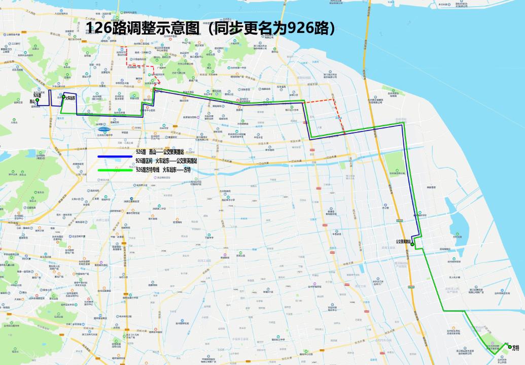 替代出行建議:臺州灣行政中心前往火車站的乘客建議乘坐926路(臺州灣行政中心西—火車站東—西山)直達。原臺州灣行政中心、甲南大道、洪三路、椒金線的乘客可乘坐調整后的925路(臺州灣行政中心西—公交客運總站)前往市民廣場、客運總站方向。
