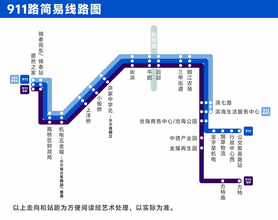 2.調(diào)整后的911路可在機(jī)電五金城、前洋洪等站點(diǎn)換乘976路往火車西站、黃巖方向;換乘305路可達(dá)恩澤醫(yī)院、日用品商城。另可在洪家中學(xué)北換乘902路A線、908路等線路前往椒江城區(qū)。