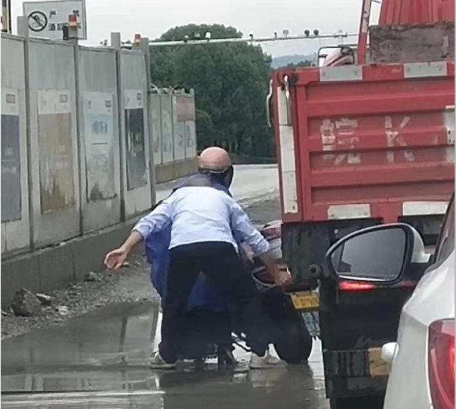 據(jù)尤再兵本人回憶說(shuō),7月10號(hào)下午15:10分左右,他駕駛車(chē)輛行駛至財(cái)富大道路段,該路段由于正在施工,地勢(shì)低洼,路面積水比較嚴(yán)重,一名駕駛電動(dòng)車(chē)的女士不慎被臨時(shí)鋪設(shè)在路面的鋼板刮倒在地。由于穿著雨披,再加上路面濕滑,騎電動(dòng)車(chē)的女士怎么也扶不起車(chē)子,情急之下,他將車(chē)輛靠邊停好,冒雨下車(chē)幫忙扶起電動(dòng)車(chē)并推到路旁,再三確認(rèn)女士沒(méi)有受傷后,這才放心回到車(chē)上,繼續(xù)投入工作。